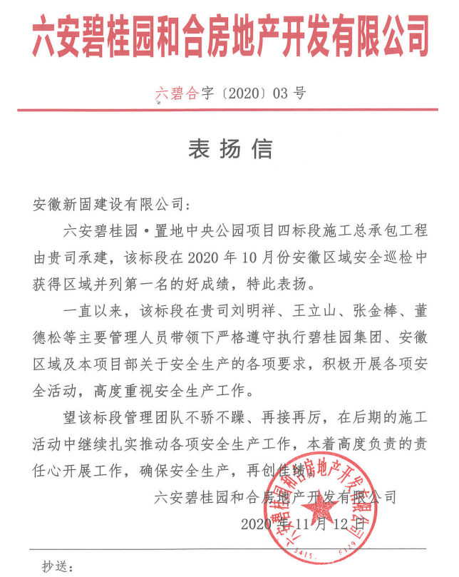 2020年10月份,該標(biāo)段在碧桂園安徽區(qū)域安全巡檢中獲得區(qū)域并列第一名的好成績(jī)。