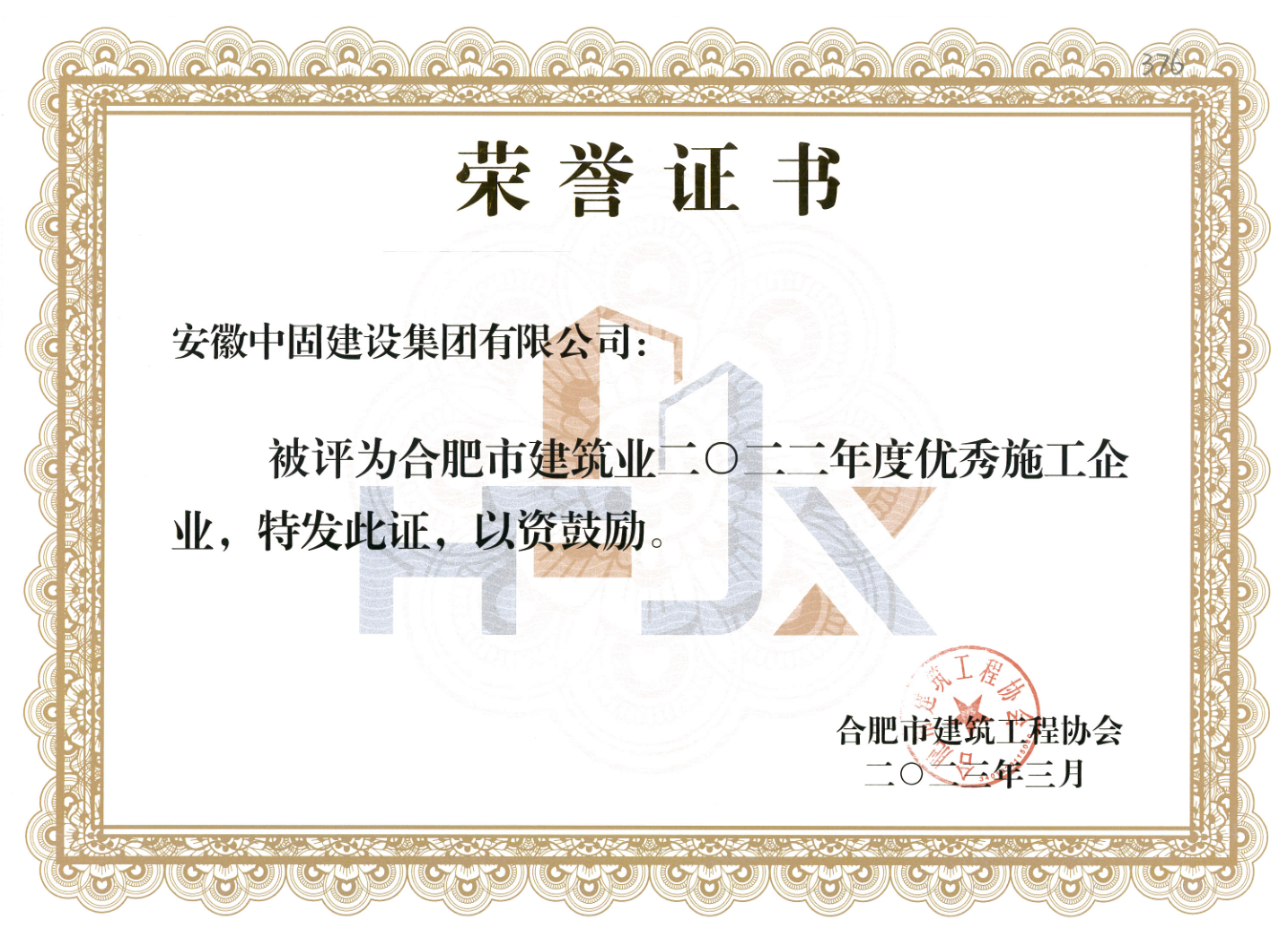 安徽中固被評為“合肥建筑業2022年度合肥建筑業優秀施工企業”