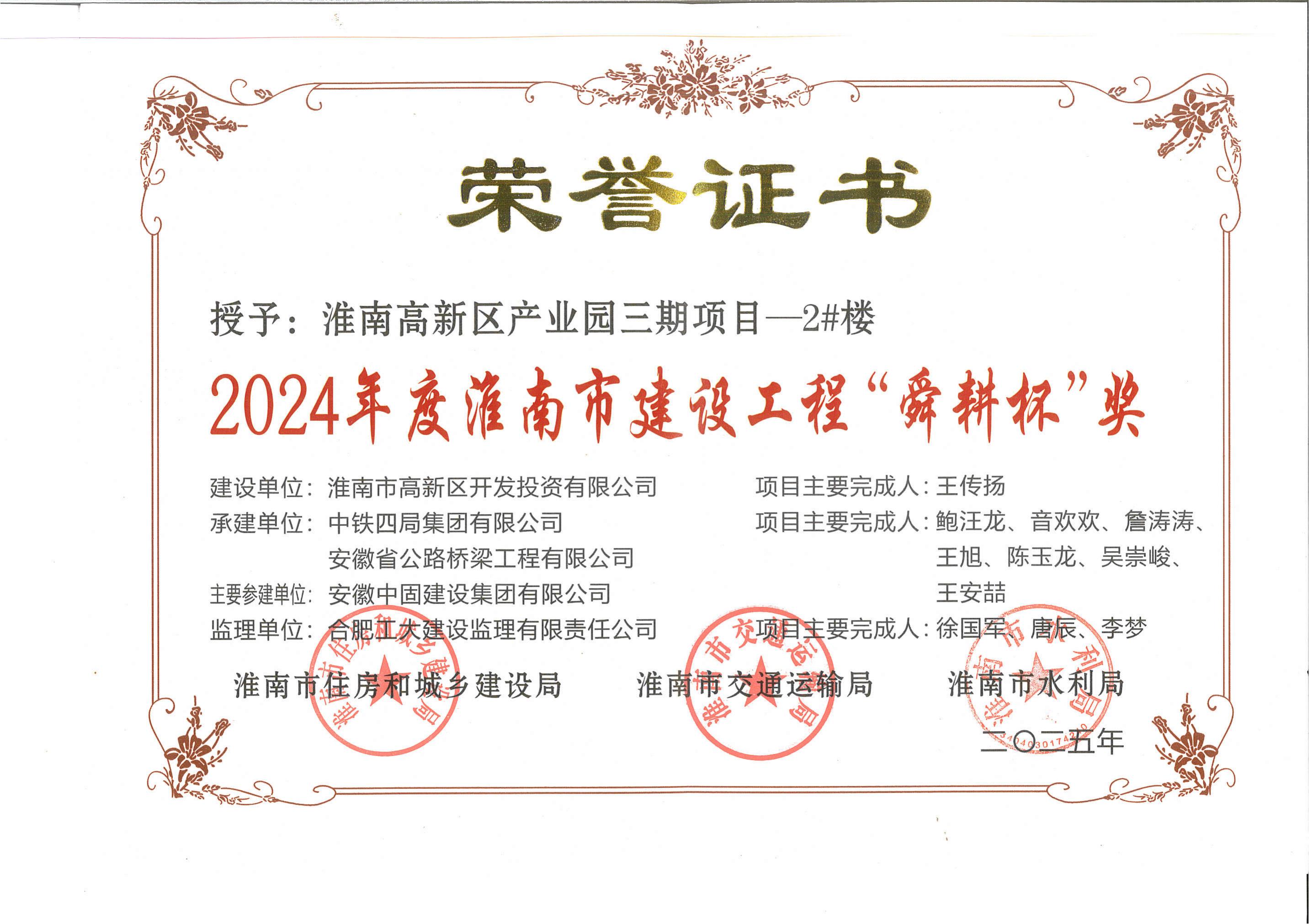 淮南高新區產業園三期項目2#樓榮獲2024年度淮南市建設工程“舜耕杯”獎