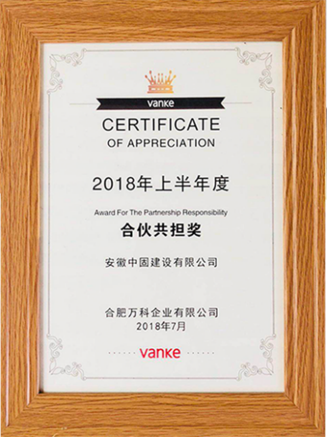 近日,合肥萬科2018年中合作伙伴溝通會議盛大召開,安徽中固建設有限公司作為萬科地產的長期合作合作伙伴應邀參會。會上,中固建設被授予“2018年上半年度合伙共擔獎”、“2018年上半年度安全管理獎”、“2018年上半年度精工比武獎”。