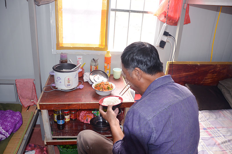 中午12點,張師傅下班做好飯,開始享受午餐。張師傅告訴筆者:“每天都是前一天晚上買好菜第二天下班后做飯,自己做著吃干凈、營養”。雖然只有一個菜,但是他卻十分享受。