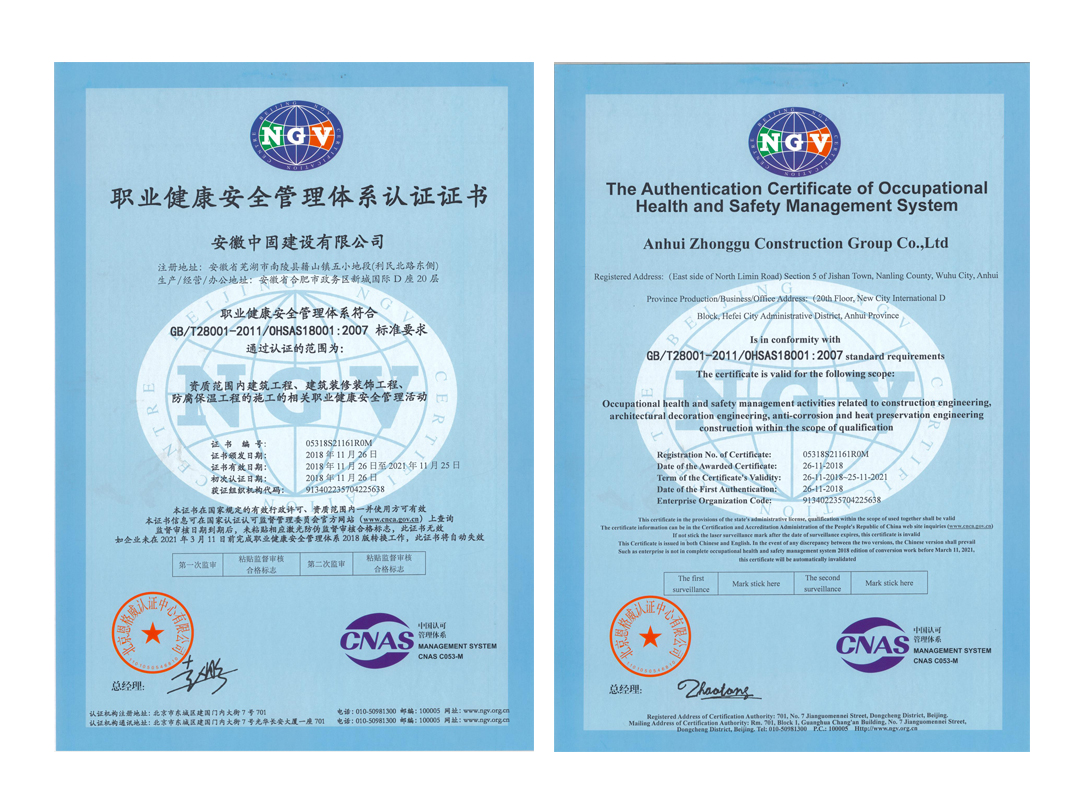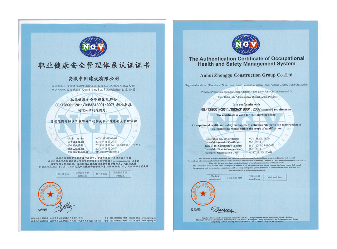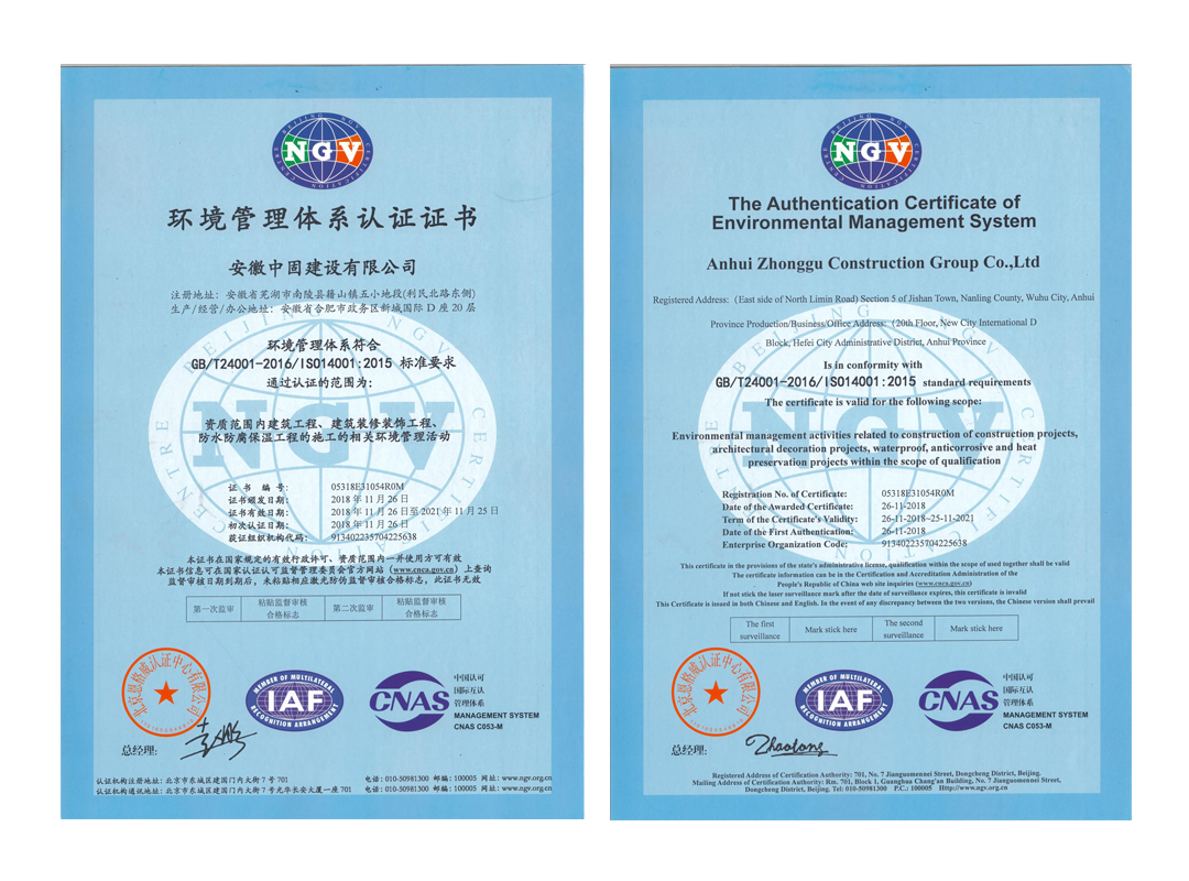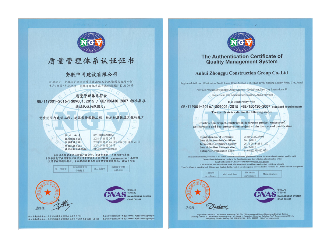 2018年11月15日至20日,北京恩格威認(rèn)證中心管理體系審核工作專家組,對我司資質(zhì)范圍內(nèi)的房屋建筑工程、裝修裝飾工程、防水防腐保溫工程施工等方面進行了全面認(rèn)證。近日,經(jīng)評審,安徽中固建設(shè)有限公司順利通過了質(zhì)量管理體系認(rèn)證、環(huán)境管理體系認(rèn)證、職業(yè)健康安全管理體系認(rèn)證等證書。